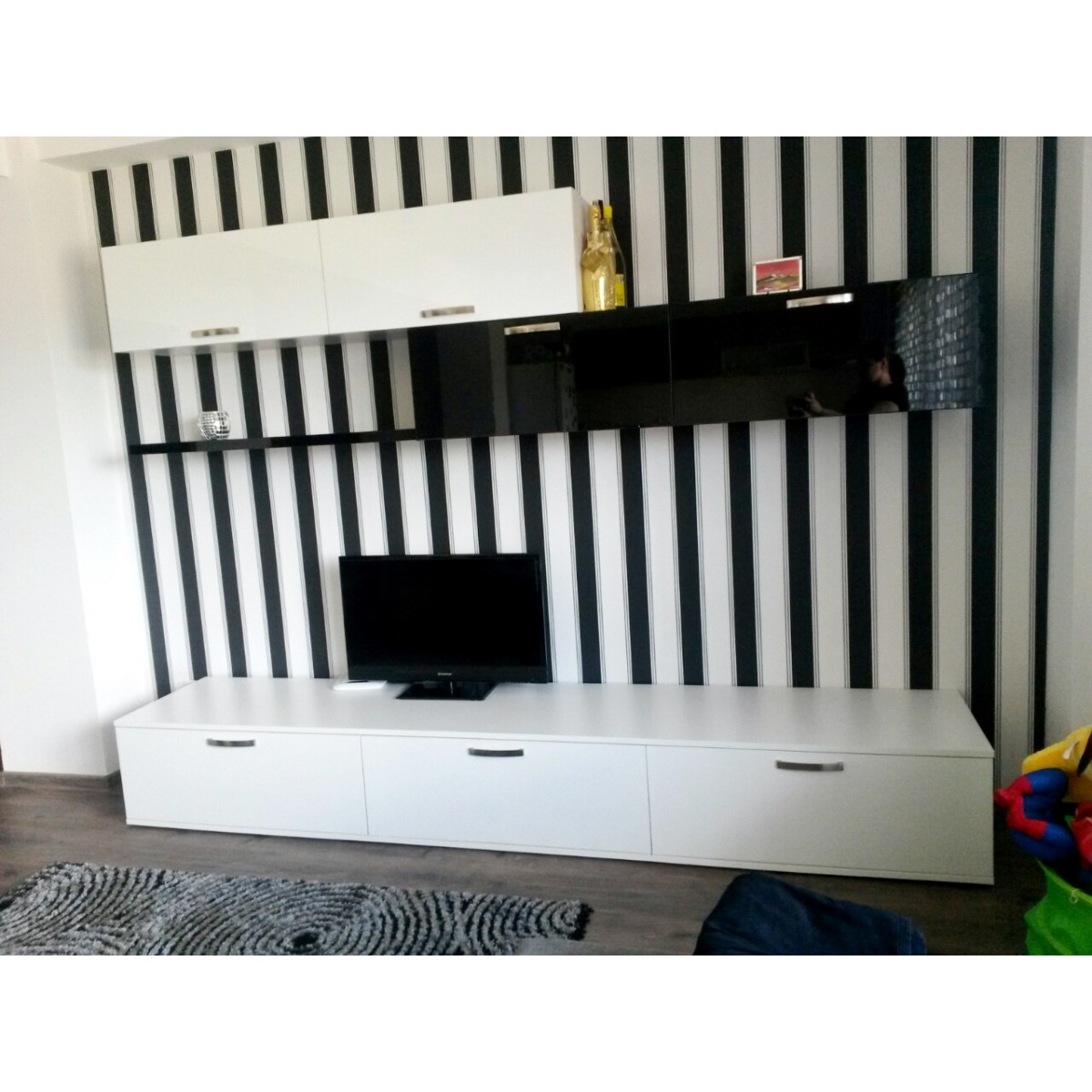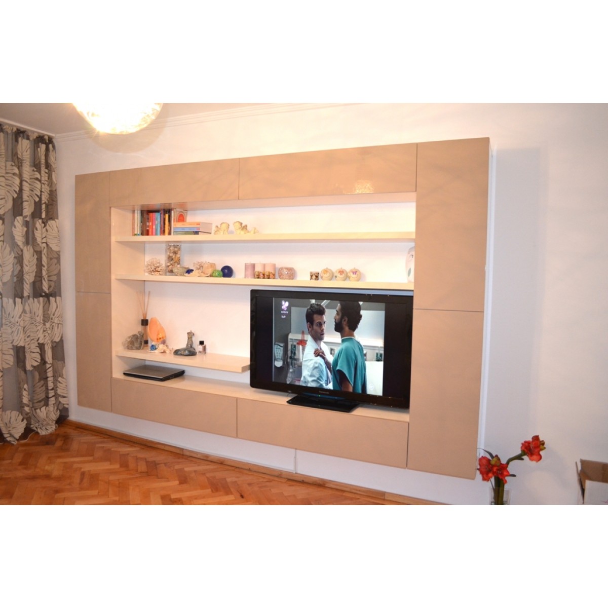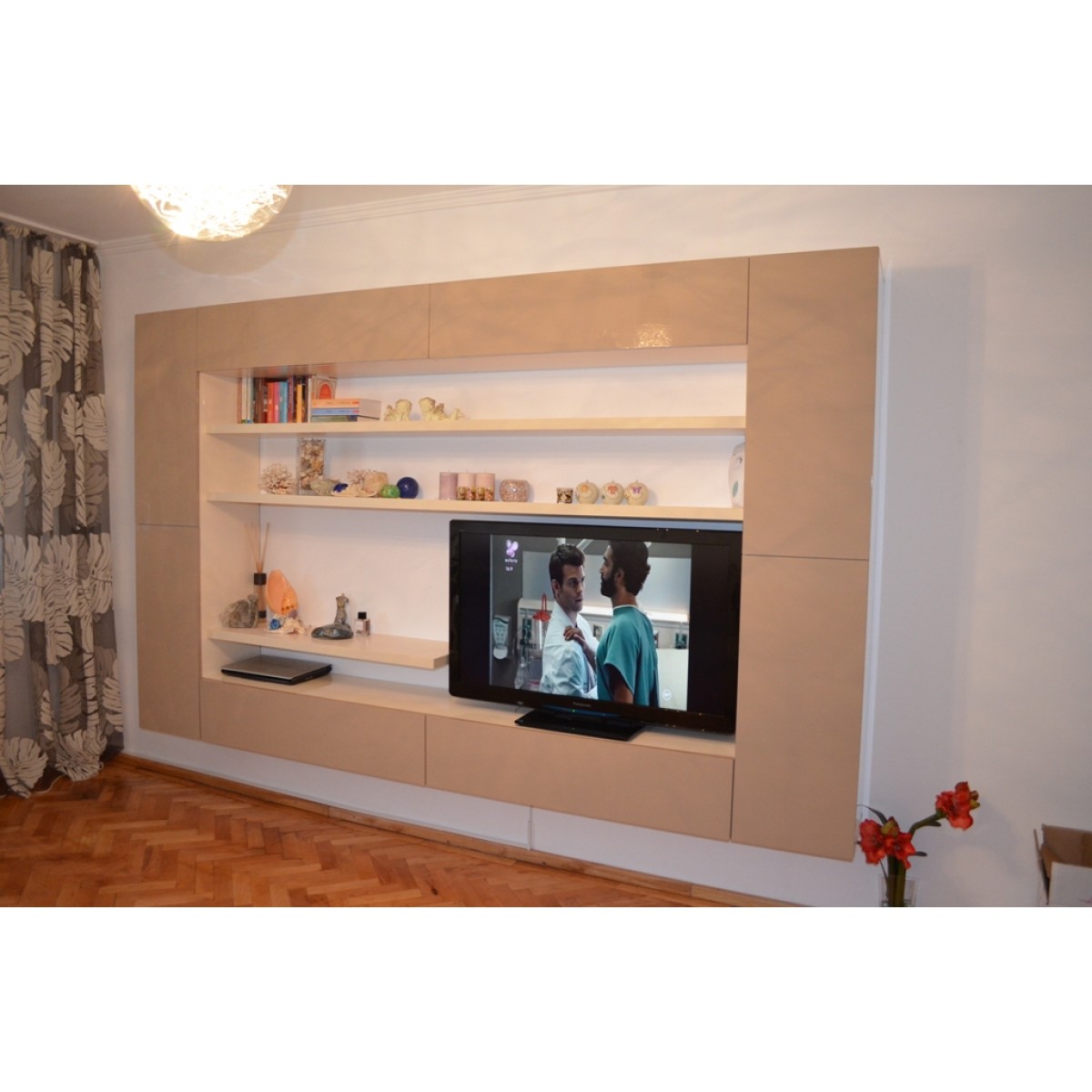 * Integrare armonioasă a zonei TV și a elementelor decorative
